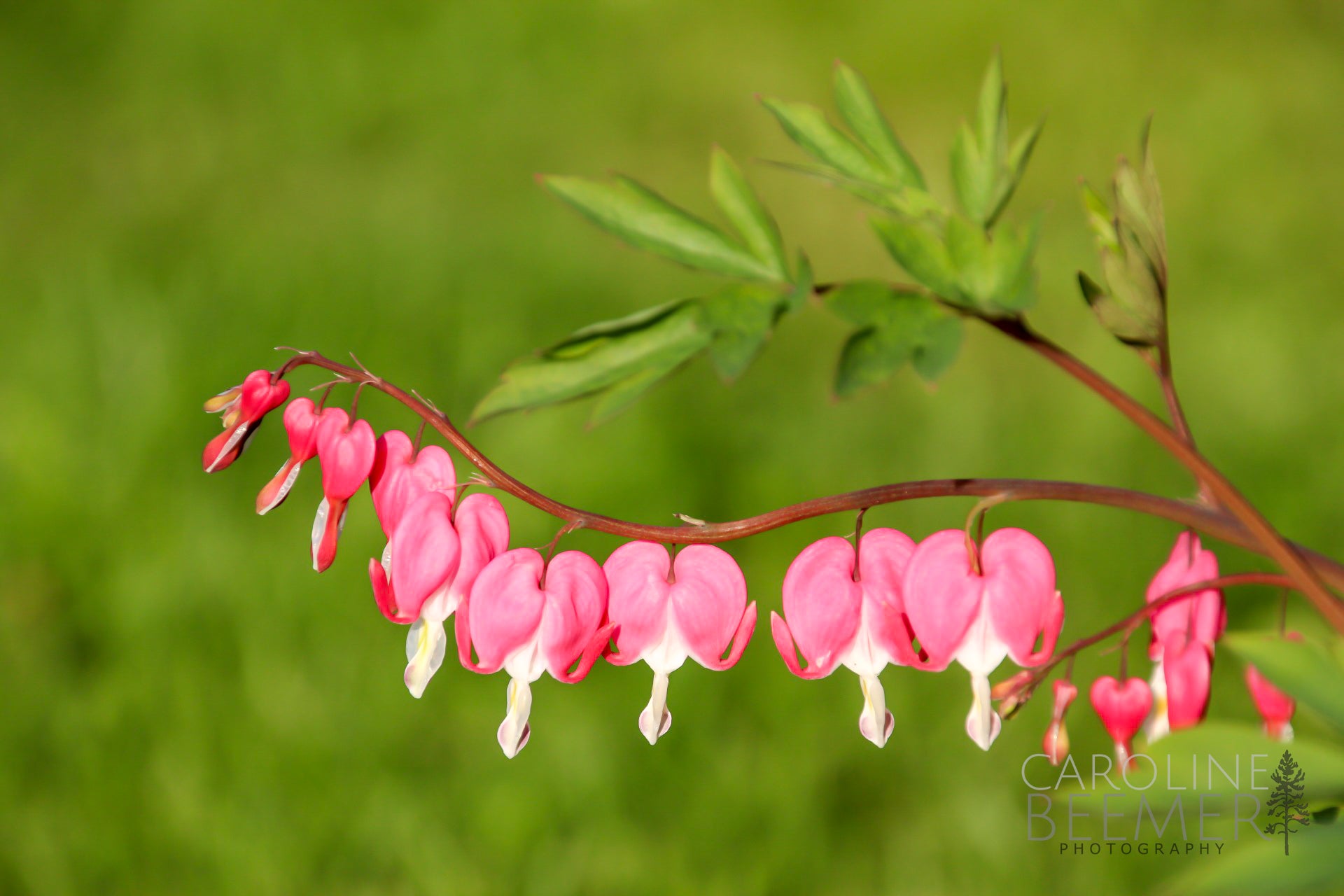 One of the first blooms in spring, a bleeding heart shows of a row of pink and white blooms.