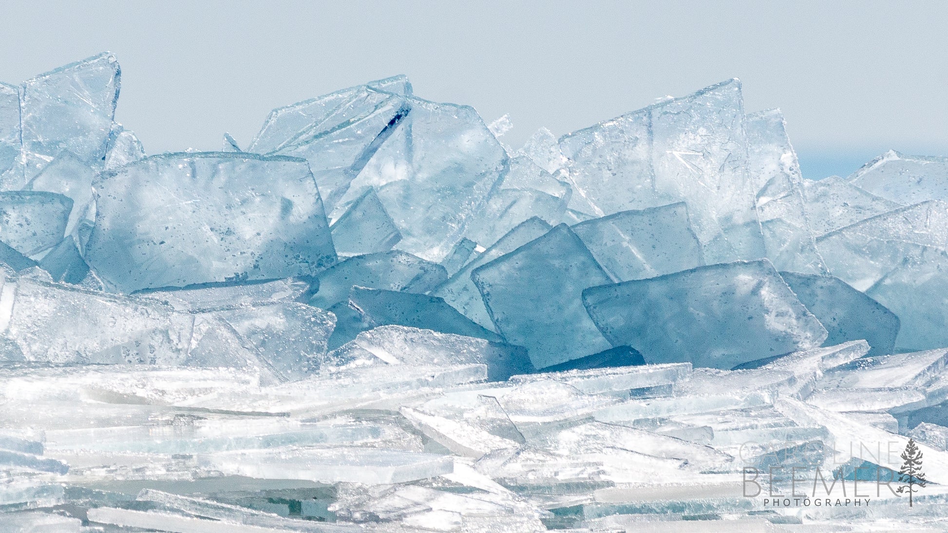 Thin sheets of ice are pushed up against the shore creating a beautiful geometric design of overlapping blues.